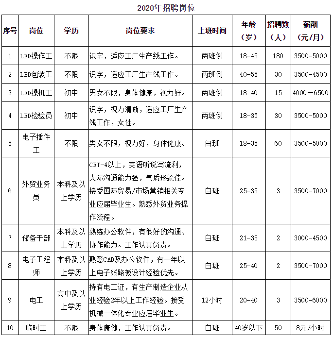 【普工招聘需求】